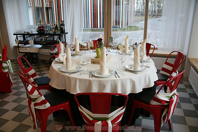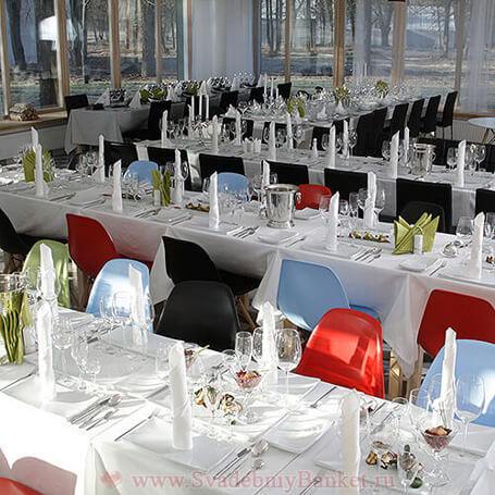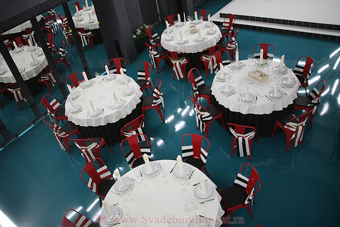 Рассадка за круглыми и прямоугольными столами одновременно: до 80 гостей возможно посадить за круглыми столами,